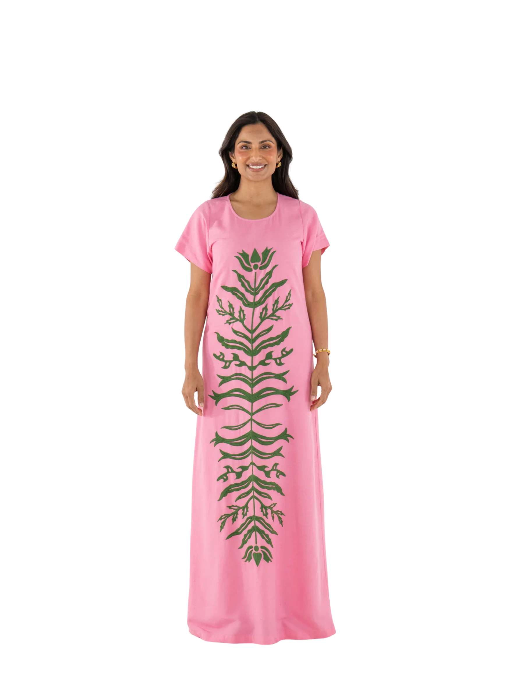 The Cornelia Dress in Rosé is a classic and foundational silhouette elevated through thoughtful craftsmanship. Designed with a round neckline, classic short sleeves, and a relaxed, flowing shape, it offers effortless polish. A green floral appliqué brings traditional Indian motifs to life, with each stitch adding subtle, artful texture. Romantic and refined, this piece feels both heirloom and modern—a true celebration of quiet detail and design.