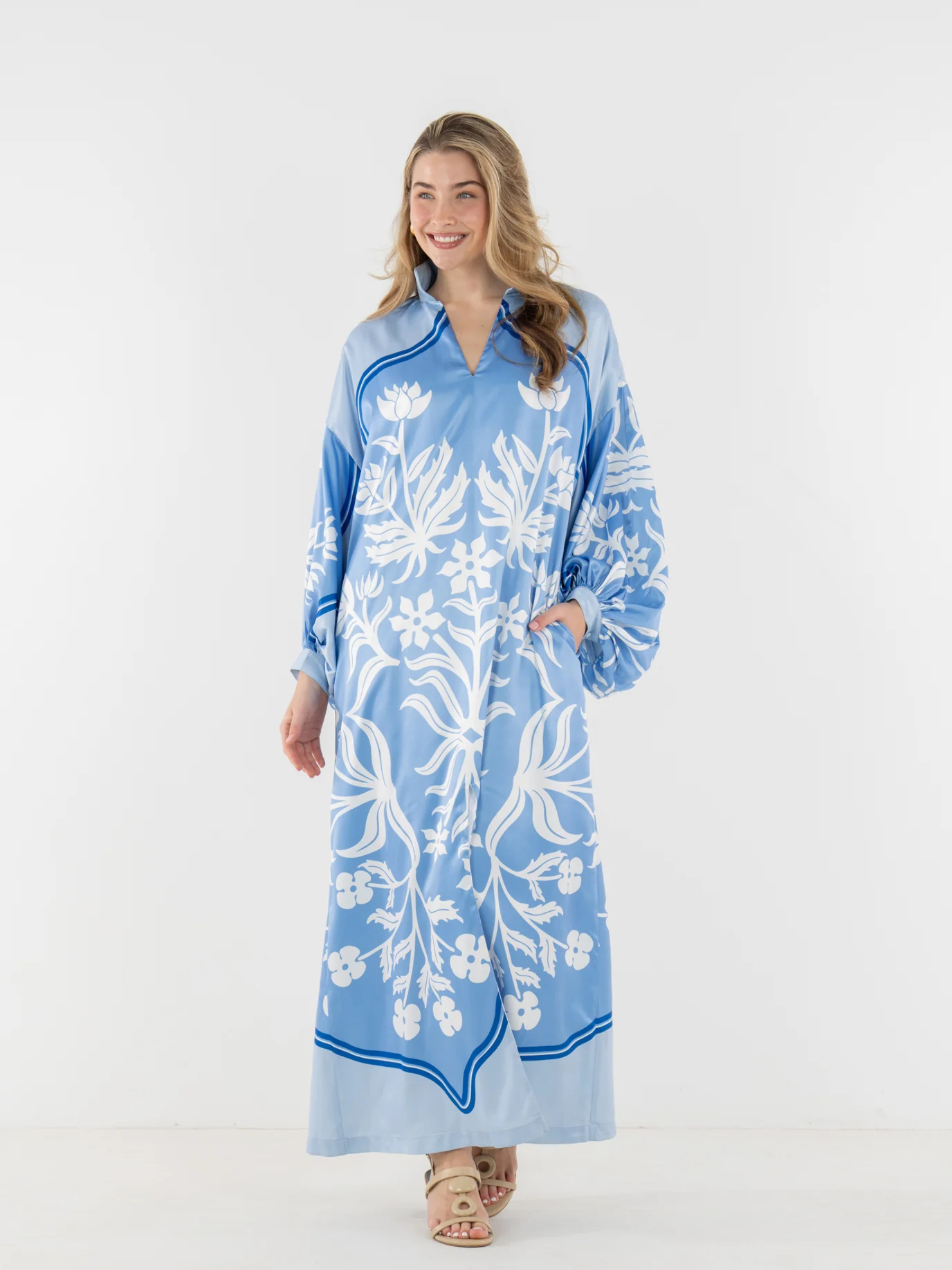 The Fiona Dress in Dutch Tile is a striking silhouette designed for elevated spring moments. Featuring a classic stand collar, dramatic blouson sleeves, and a relaxed, flowing shape, it’s finished with functional side pockets and a front slit for graceful movement. The Dutch Tile print cascades across the dress in timeless blue-and-white florals, making it an immaculate choice for spring soirées and wedding guest statements.