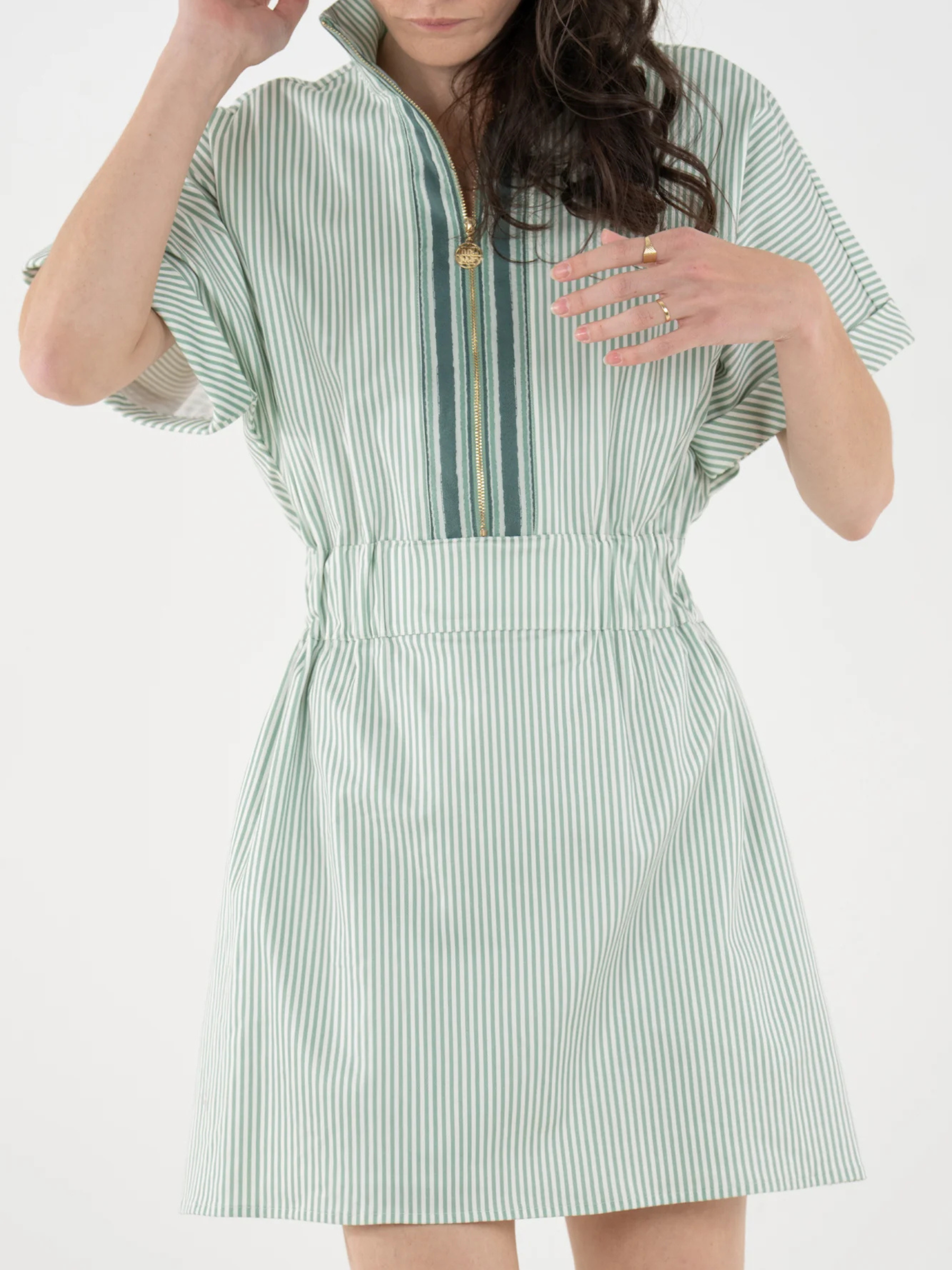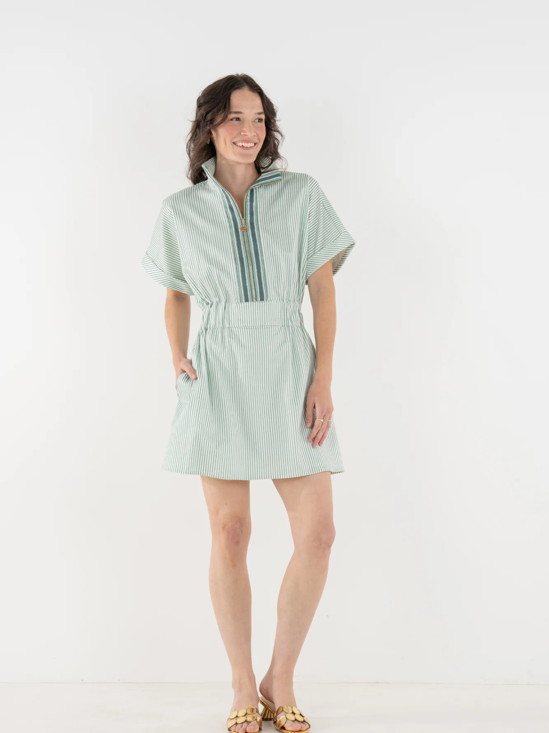 The Pullover Dress in Feldspar Stripe blends classic ease with a sporty, modern feel. Designed with a zip-front neckline finished with our gold logo pull, this style features short dolman sleeves, a cinched elastic waistband, and functional side pockets for everyday wear. Effortlessly versatile, it transitions seamlessly with a simple change of shoes or accessories—making it a polished, practical staple for spring and beyond.