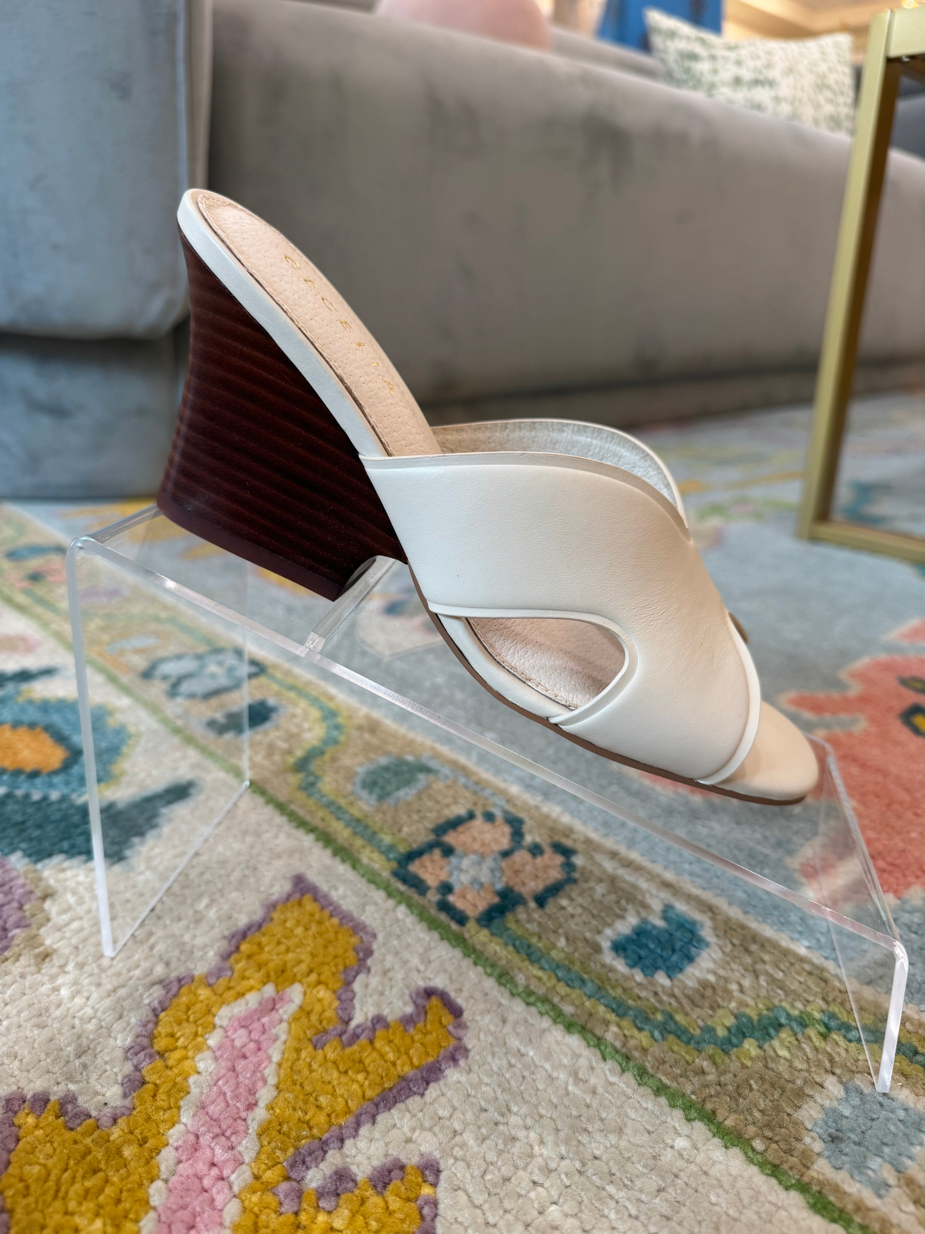 Clean lines and confident height define this modern wedge slide, designed for effortless sophistication. Wide crisscross leather straps create a sleek, minimalist silhouette that feels refined and versatile, making it an easy choice for elevated everyday dressing. Set atop a beautifully balanced wood-stacked wedge and chunky block heel, this sandal offers substantial lift without sacrificing stability. The sculpted profile elongates the leg while maintaining a grounded, wearable feel, ideal for long days, polished work looks, or weekend styling.