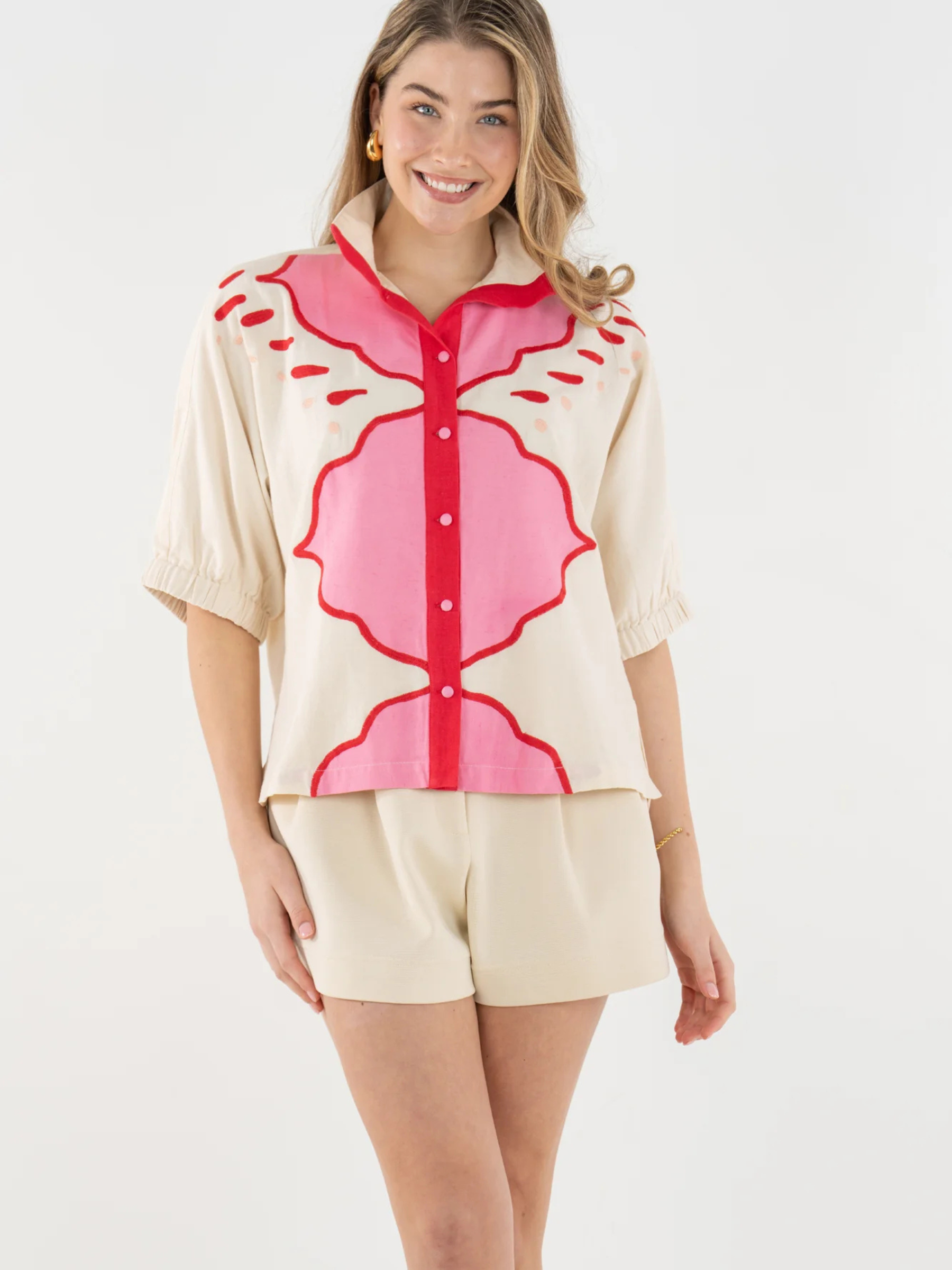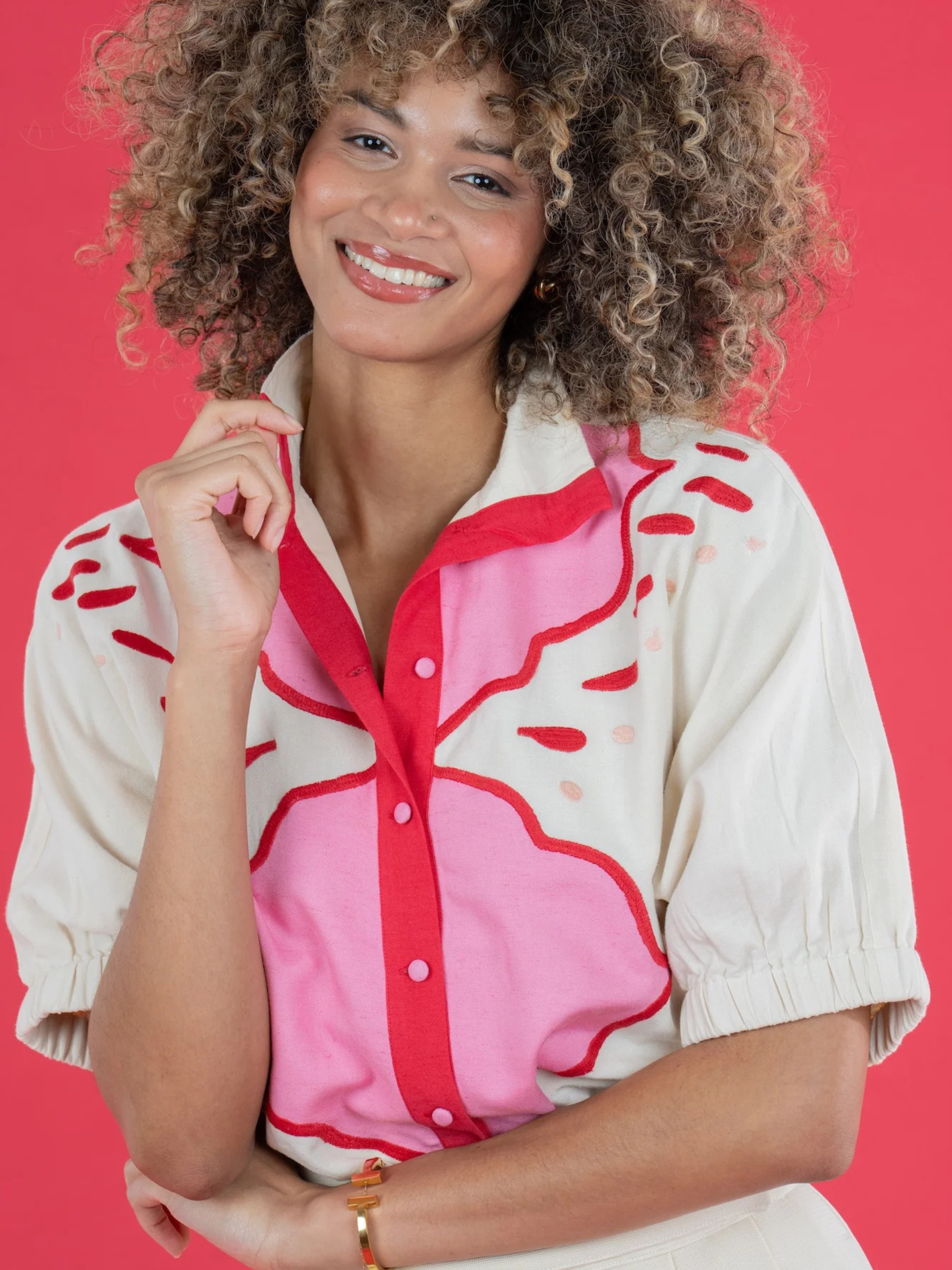 The Bonny Top in Pink Palace draws inspiration from the ornate geometric designs and romantic hues of Jaipur’s storied architecture. Intricate embroidery adds dimension and artistry, creating a striking interplay of pattern and texture. Designed with a classic stand collar, covered front button closure, and relaxed dolman sleeves with soft elastic cuffs, the silhouette drapes with effortless ease. Finished with a loose, flowing shape, this piece feels both artful and refined—an elevated statement rooted in thoughtful design and global influence.
