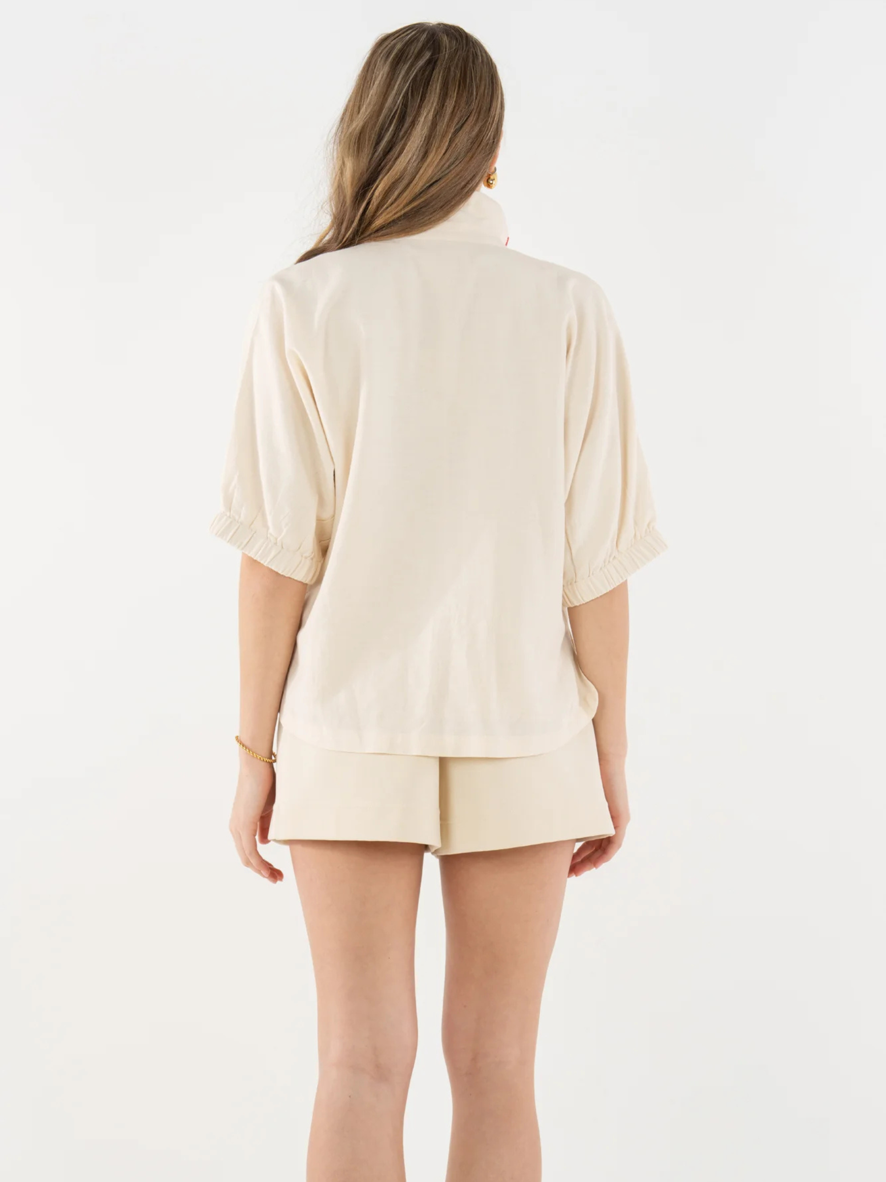 Classic stand collar Loose elastic dolman sleeves Front button closure Loose fitting silhouette 82% Viscose / 18% Linen Lining: 100% Polyeste