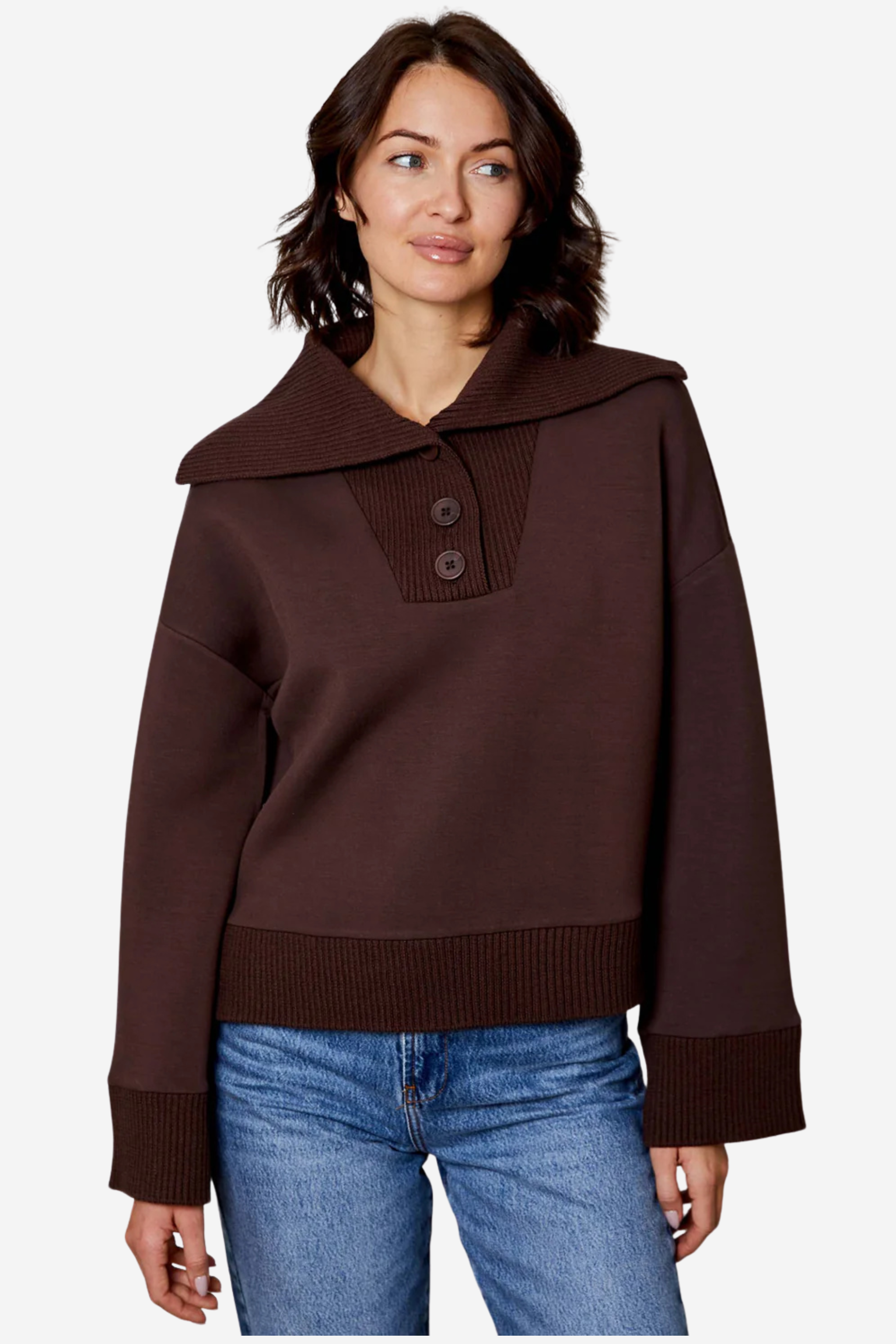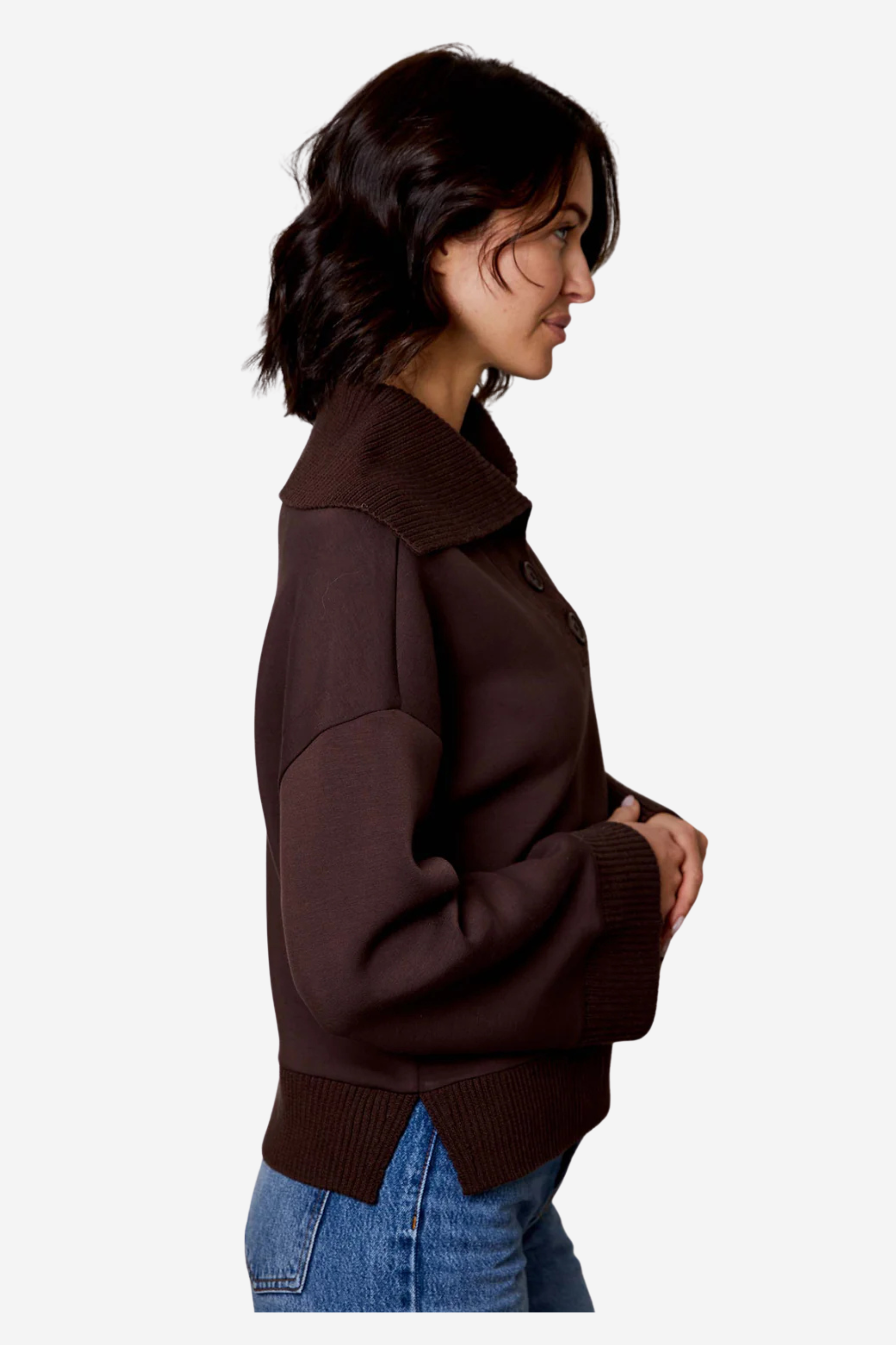 - Sweater knit rib collar, hem and sleeve trim - Boxy fit with drop shoulder - Rib yoke insert with button closure
