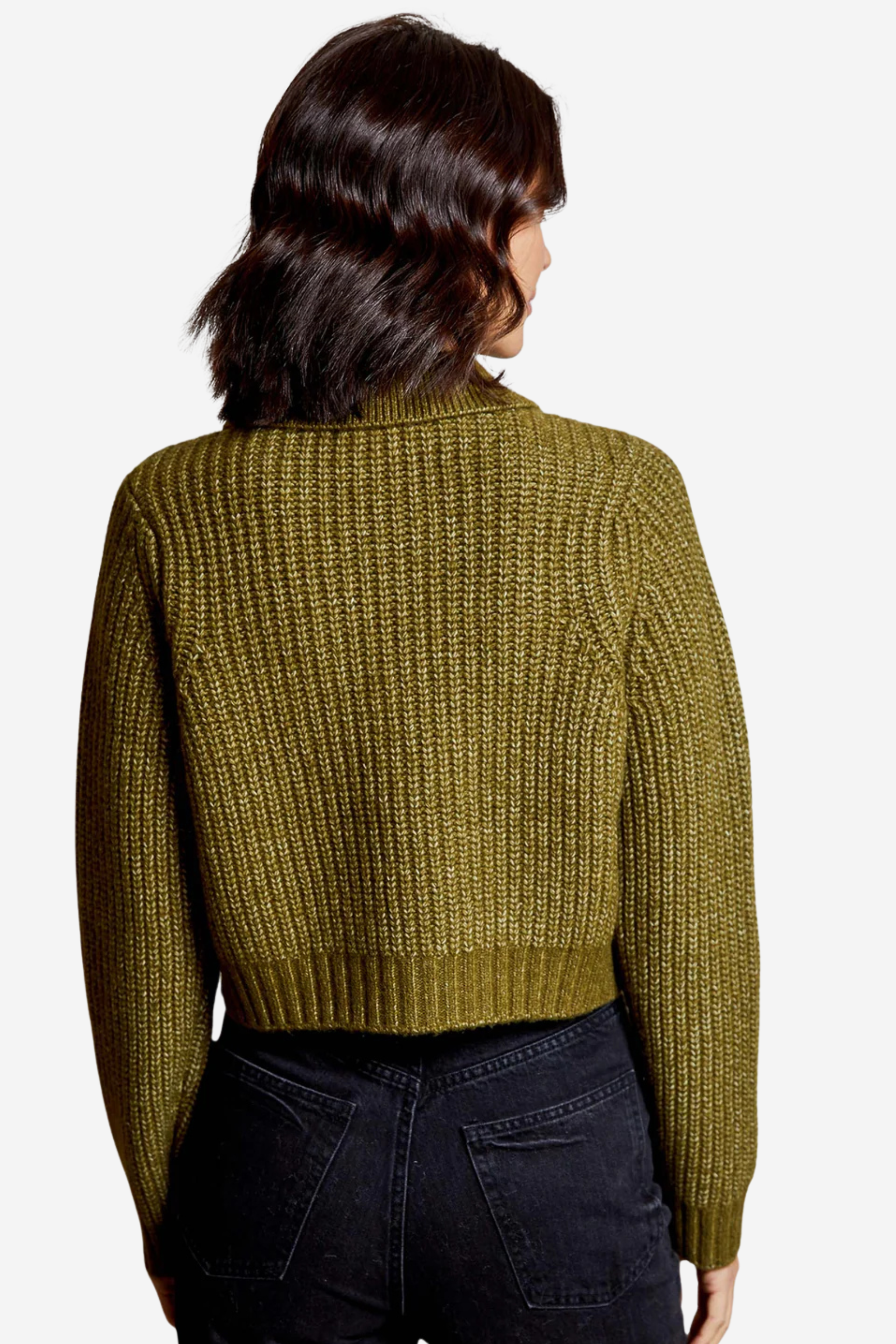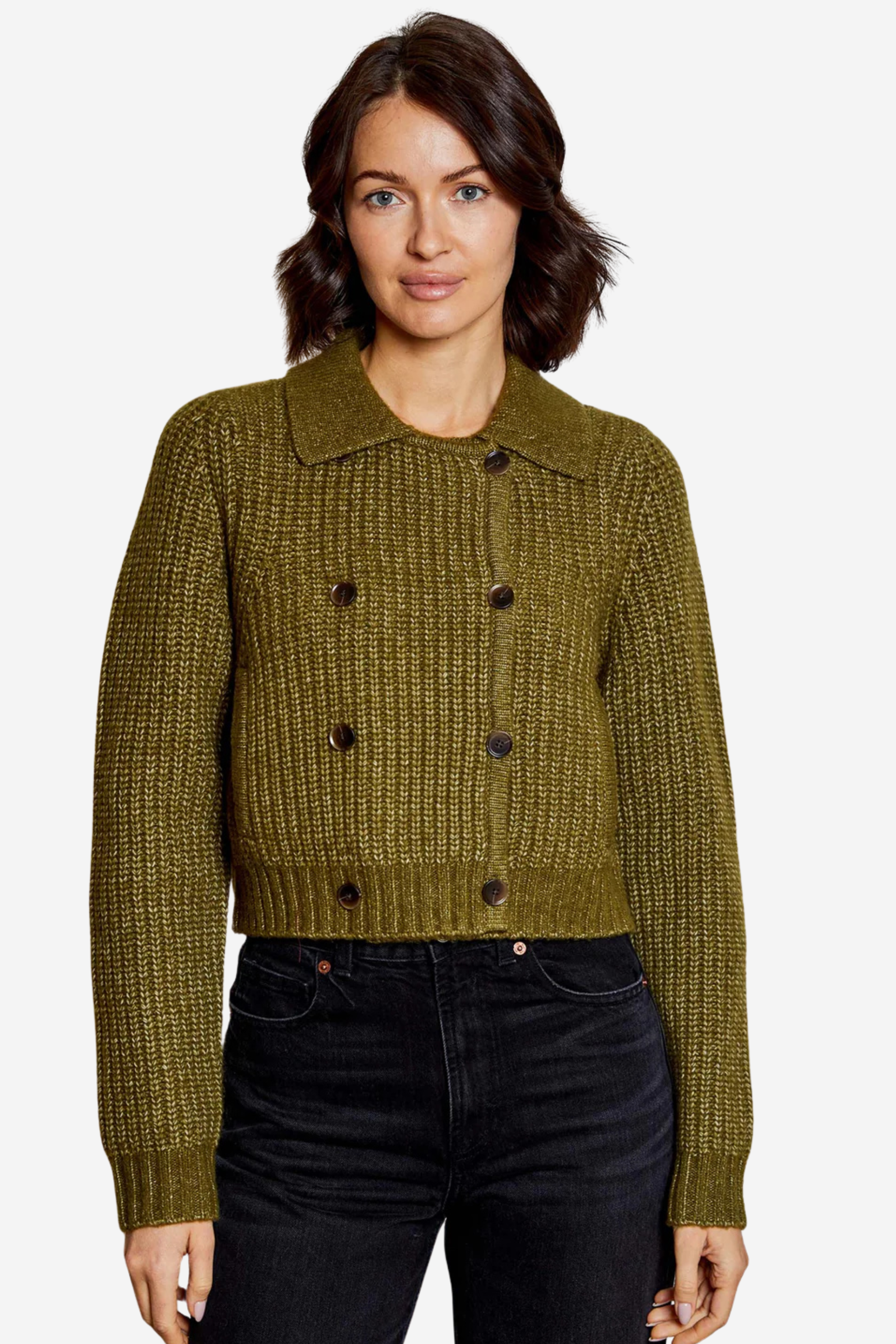 - All over chunky fisherman rib stitch - Hand warmer pockets - Pointed collar neck trim and rib trim at hem and cuff